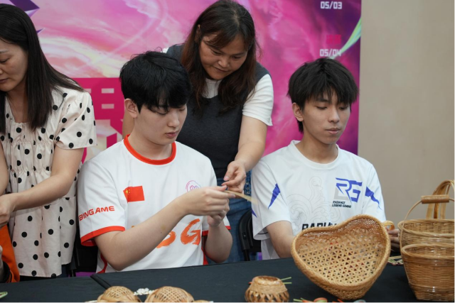 During their visit to the carnival, the players engaged in hands-on sessions of Guangcai, Guangxiu, and bamboo weaving. Van, a player from the EVOS club of the Indonesia region, with a passion for painting, quickly mastered the techniques of Guangcai, painting vibrant colors on a porcelain plate. "My hobby is drawing," he said. Jian Xiuqing, a Guangcai master from Guangzhou Yicai Porcelain Design Co., Ltd., noted that the players were very quick to grasp the techniques of Guangcai, especially Van, who filled in colors well, even for small leaves and flowers on the plate. Gusta, a player from the A7 club of the Latin American region, painted a red cotton flower and expressed his admiration for the art form's beauty and creativity.
