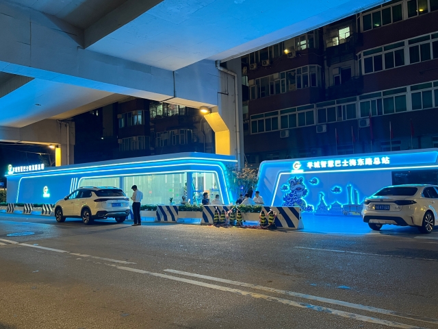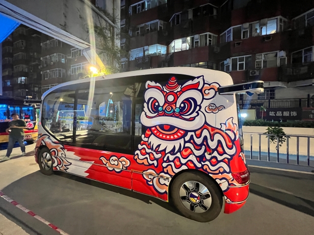 Around 10 PM on April 28, the bus route sign was illuminated at the intersection of Zhongshan 1st Road and Meidong Road, near Exit D of Yangji Metro Station. The buses, which can accommodate six passengers each, feature vibrant lion designs and are themed in red, green, yellow, and purple.