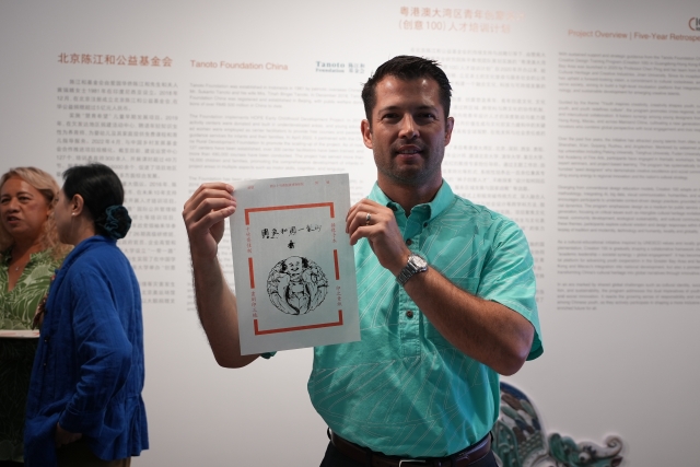 Dane K. Wicker, Hawaii's Deputy Director of Business Development, holds a piece of woodblock printing.