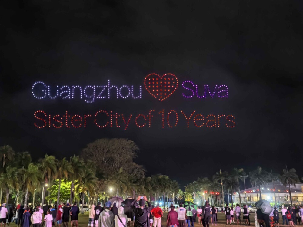 On September 27 (local time), to mark the 50th anniversary of diplomatic relations between China and Fiji, the 10th anniversary of friendly exchanges between Guangzhou and the capital city Suva, and 170 years since Chinese immigrants first arrived in Fiji, a fleet of 600 drones performed a light show over Suva.