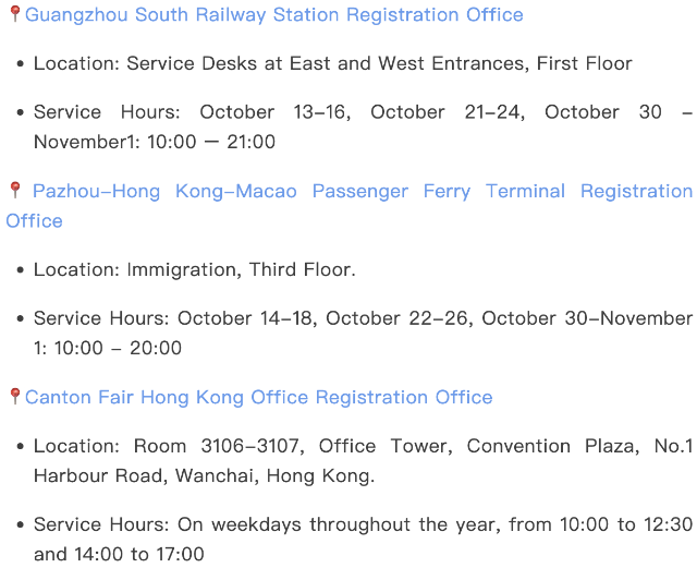 Additional registration points are available at Guangzhou South Railway Station, the Pazhou-Hong Kong-Macao Passenger Ferry Terminal, the Canton Fair Hong Kong Office, and 60 designated hotels.