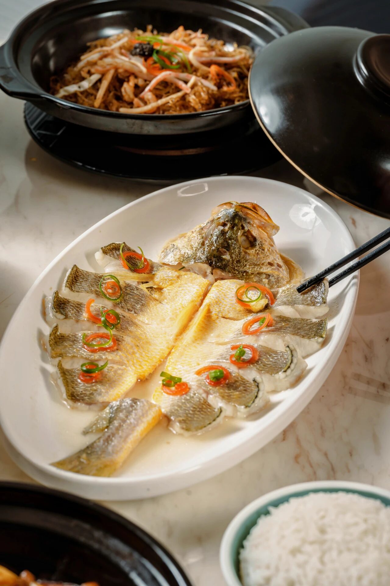 Seafood is also a highlight, with oysters, shrimp, and crabs filling markets and menus. Steamed sea bass, gently cooked with ginger and scallions and finished with hot oil and soy sauce, captures the pure freshness of Cantonese cuisine.