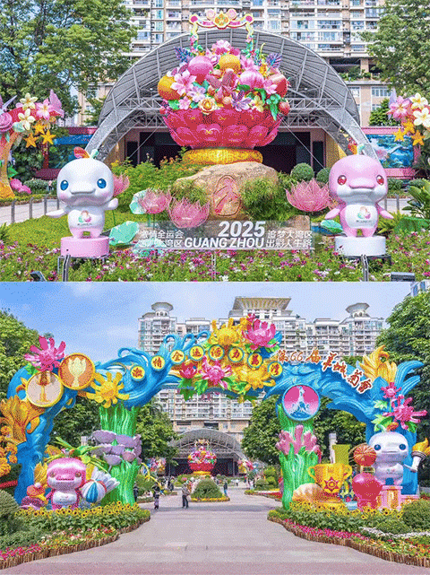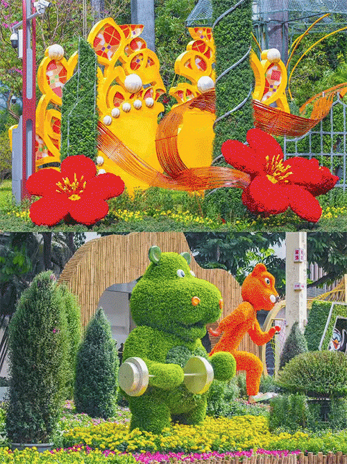 This year's exhibition integrates elements of the 15th National Games, currently being hosted by Guangdong, Hong Kong, and Macao. Among the 12 major chrysanthemum displays, highlights include the incorporation of mascots from the National Games, while floral animals such as hippos lifting weights and leopards racing add playful energy. Another display features chrysanthemums arranged to resemble footballs, volleyballs, and badminton equipment.