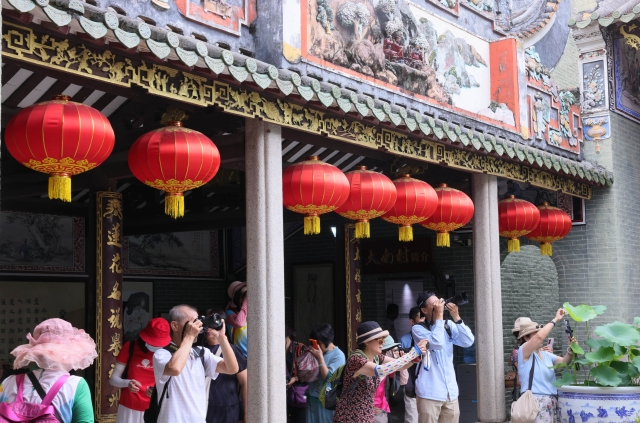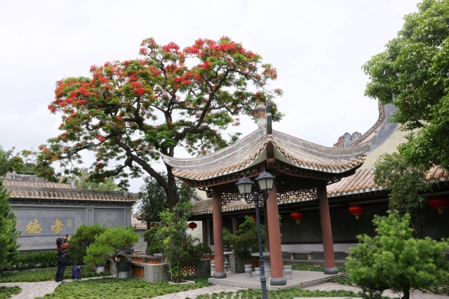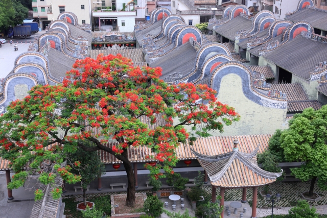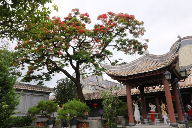 As summer arrives, phoenix trees (Delonix regia) are in full bloom across Guangzhou, including at the Zhou Clan Ancestral Hall (周氏大宗祠) in Nancun Village, Longgui Subdistrict, Baiyun District. In Yiyuan Garden (颐园), the vibrant red flowers of a phoenix tree complement the ancient architecture, while outside the garden, the blossoms against the blue sky create a striking scene. Tourists flock to capture the beauty of this 'internet-famous' flower.