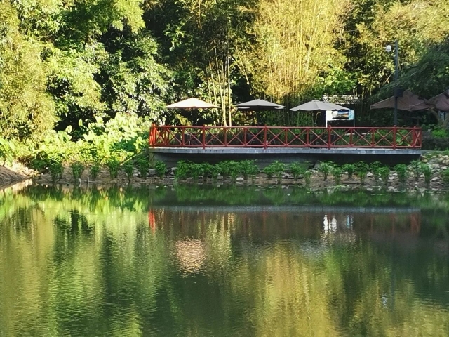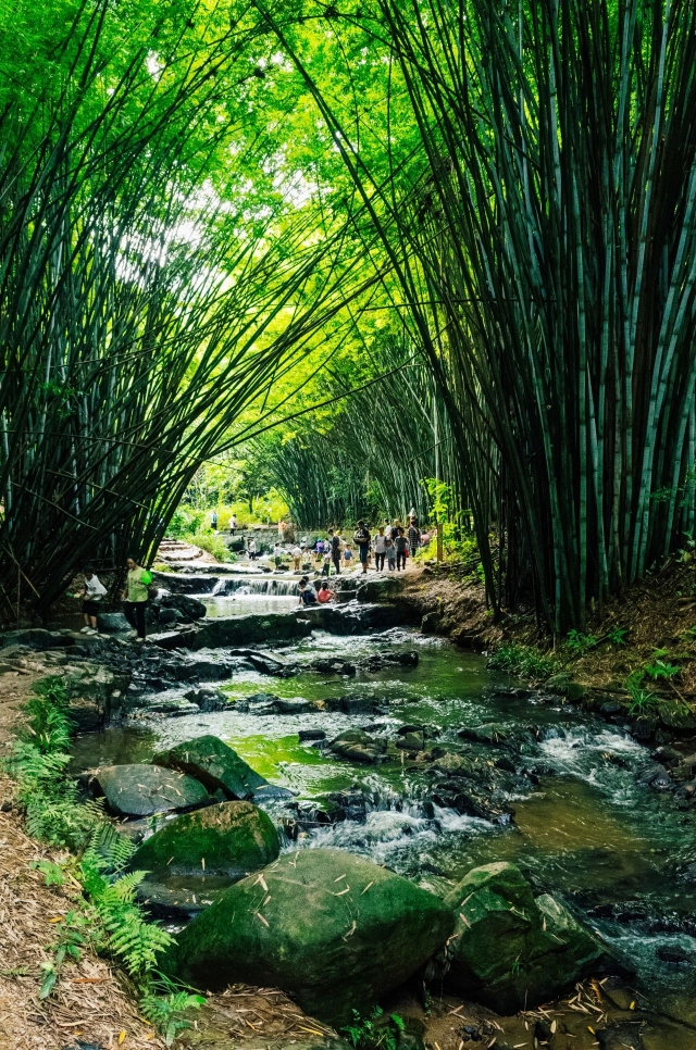 Cuizhu Garden features over 30 varieties of bamboo, forming a shady tunnel perfect for summer walks. A gentle brook flows through the bamboo, offering a quiet spot for playful splashing. Visitors can also continue on to the 520-meter boardwalk at Huangpodong Reservoir for serene views of water, forest, and distant hills.