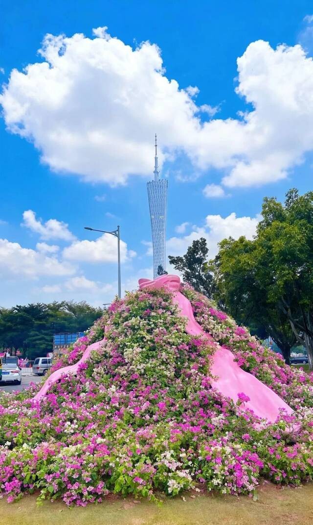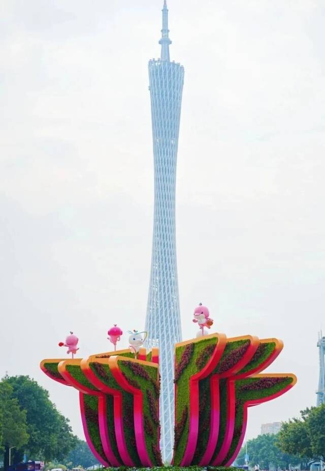 3. "Kapok of Guangzhou" installation: A giant kapok flower composed of 15 “广”-shaped components, with the Canton Tower framed at its center.