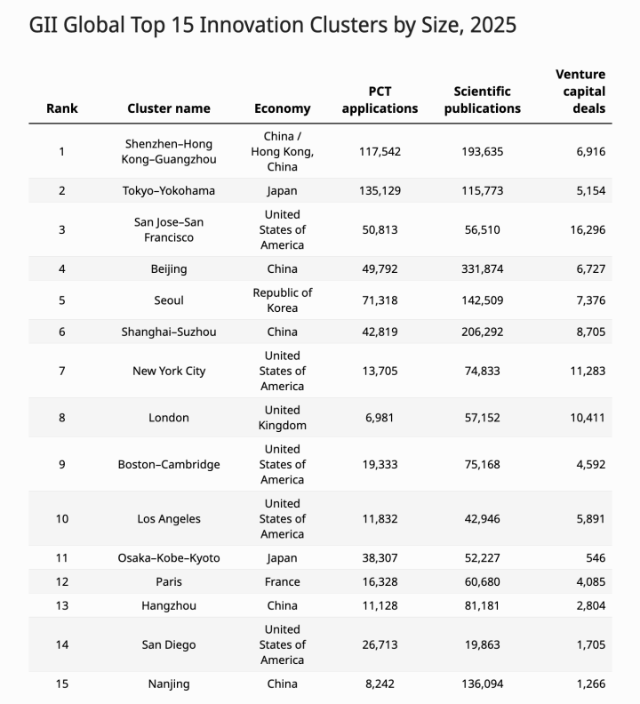 Established in 2017, the GII Cluster ranking identifies local concentrations of world-class innovation activity using three key metrics: international patent filings via WIPO's Patent Cooperation Treaty, scientific publications, and, new this year, the number of venture capital deals.